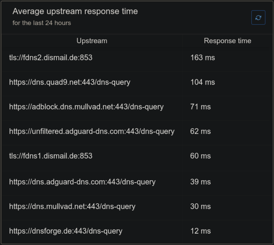 }I have set up these upstreams, and the Dashboard shows their response times and load balances between them. AdGuard Home uses a weighted random algorithm to select servers with the lowest number of failed lookups and the lowest average lookup time: